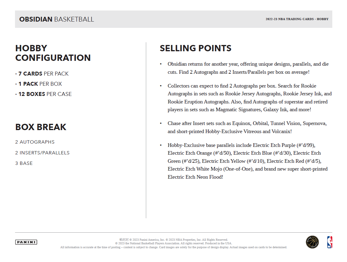 2022-23 Panini Obsidian NBA Basketball Cards PRODUCT HIGHLIGHTS: