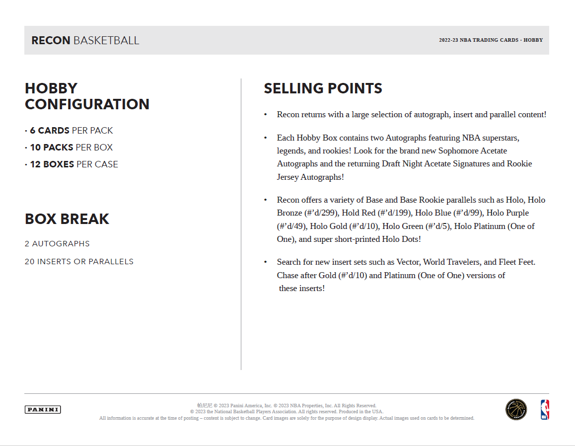 2022-23 Panini Recon NBA Basketball Cards PRODUCT HIGHLIGHTS: