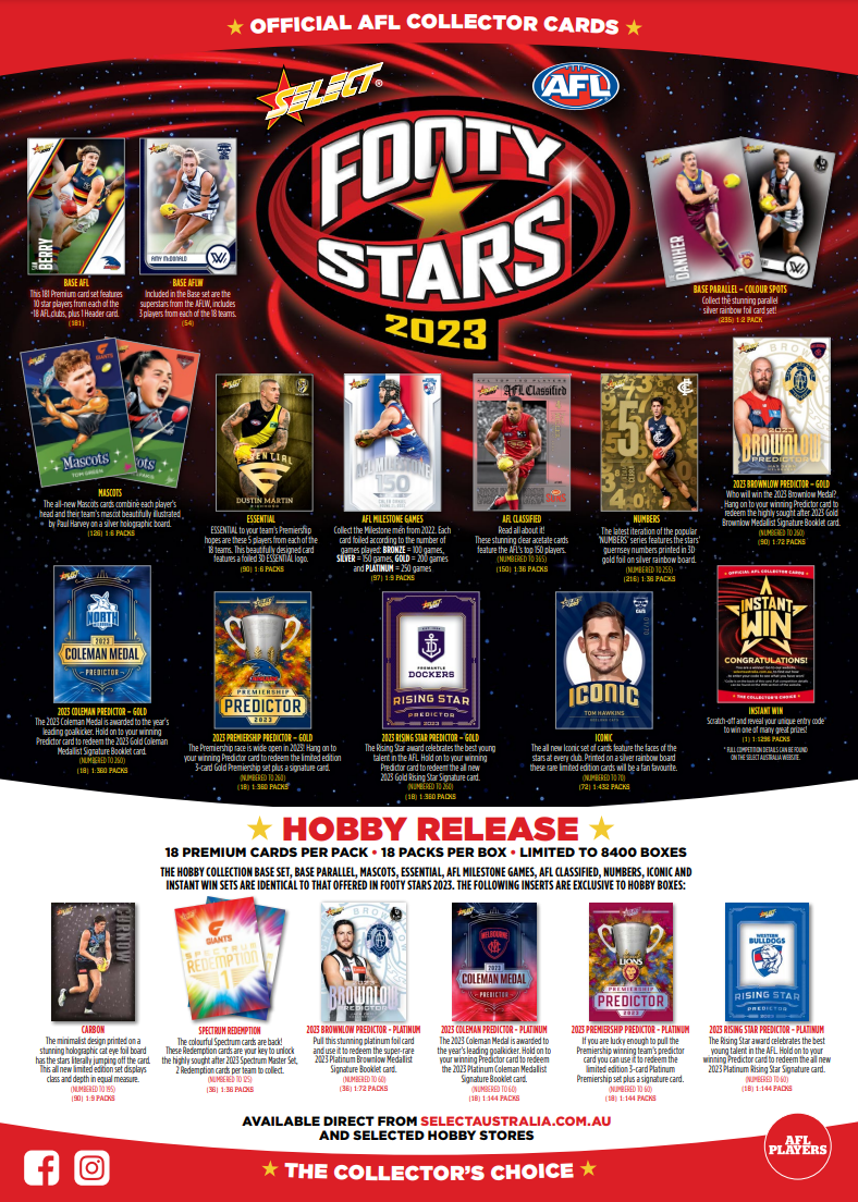 The Footy Stars Hobby release features a number of the insert sets which also appear in the Footy Stars Retail release together with some exclusive Hobby insert sets.